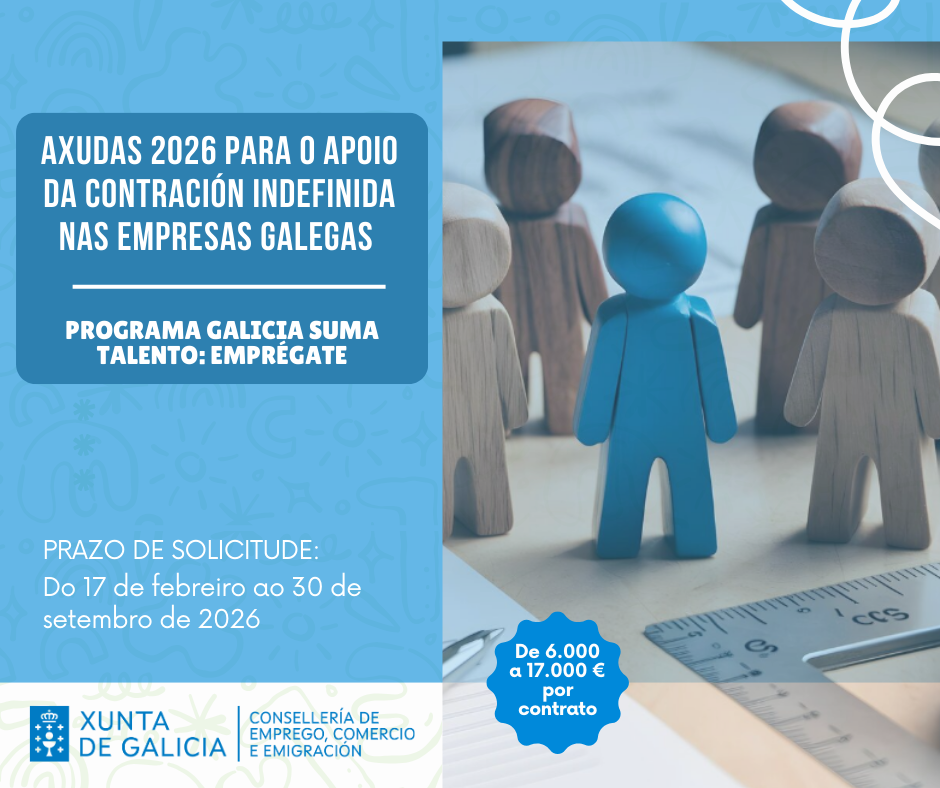 Publicada a convocatoria de axudas da Xunta de Galicia para o fomento da contratación indefinida por parte das empresas galegas (Programa Galicia Suma Talento: Emprégate), a través do que se subvencionan tanto a realización de novas contratacións indefinidas como a transformación en indefinidos de certos contratos formativos, o incremento de xornadas laborais parciais ou a adaptación de postos para persoas con discapacidade. - PROGRAMA BONO PERSOAS AUTÓNOMAS 2026