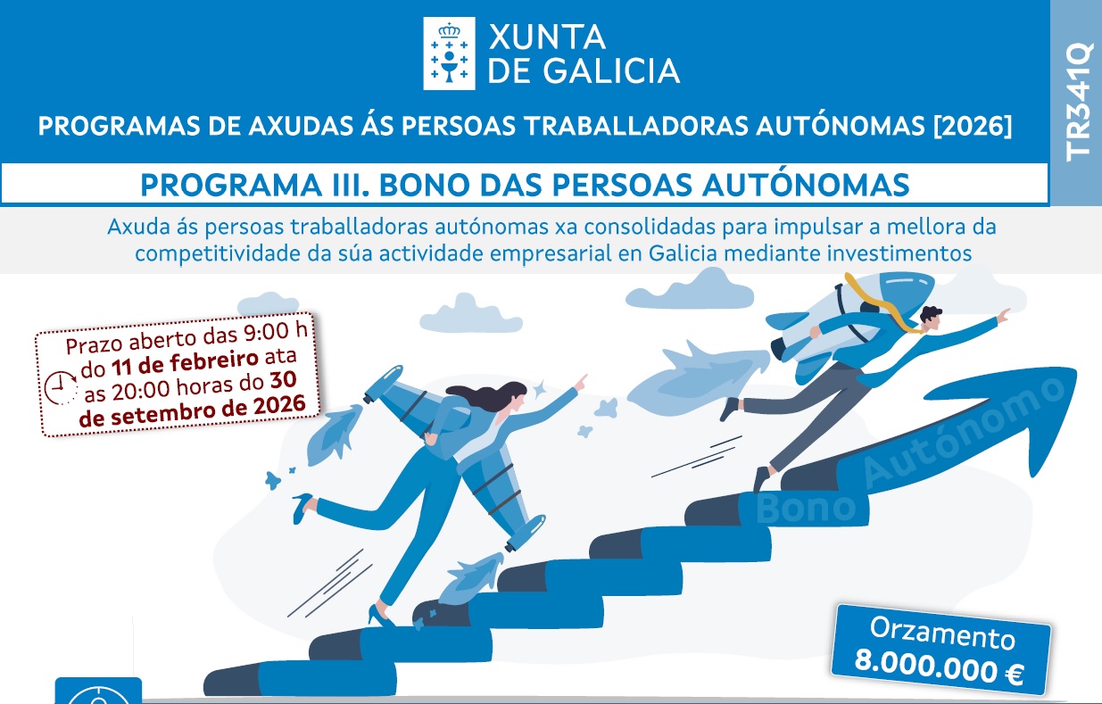 A Orde de 30 de decembro de 2025 aproba as bases reguladoras polas cales se rixe a convocatoria pública de axudas do Programa III correspondente ao Bono das persoas traballadoras autónomas, dirixidas ás persoas autónomas xa consolidadas, no ámbito da Comunidade Autónoma de Galicia, para impulsar a mellora da competitividade dos seus negocios mediante investimentos relacionados directamente cos mesmos, para o ano 2026. (Código de procedimento TR341Q)